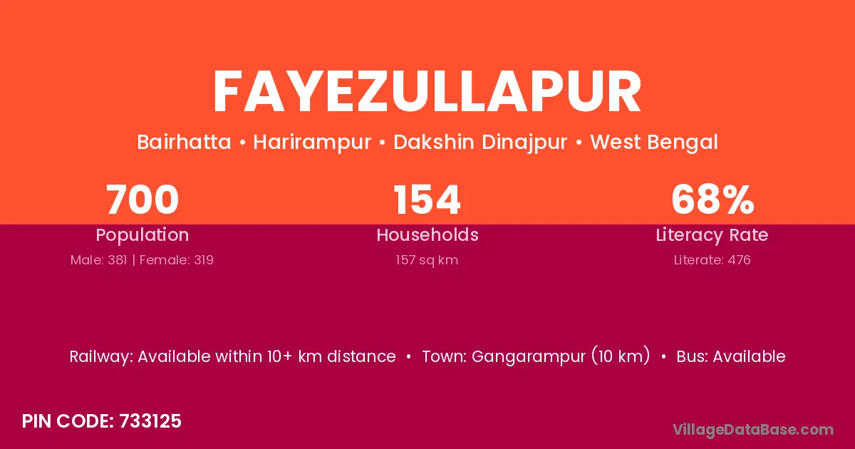 Gangarampur (10 km) is the nearest town to Fayezullapur village for major economic activities and is located approximately 10 km away.