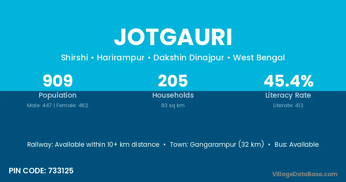 Gangarampur (32 km) is the nearest town to Jotgauri village for major economic activities and is located approximately 32 km away.