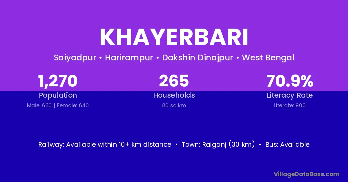 Raiganj (30 km) is the nearest town to Khayerbari village for major economic activities and is located approximately 30 km away.