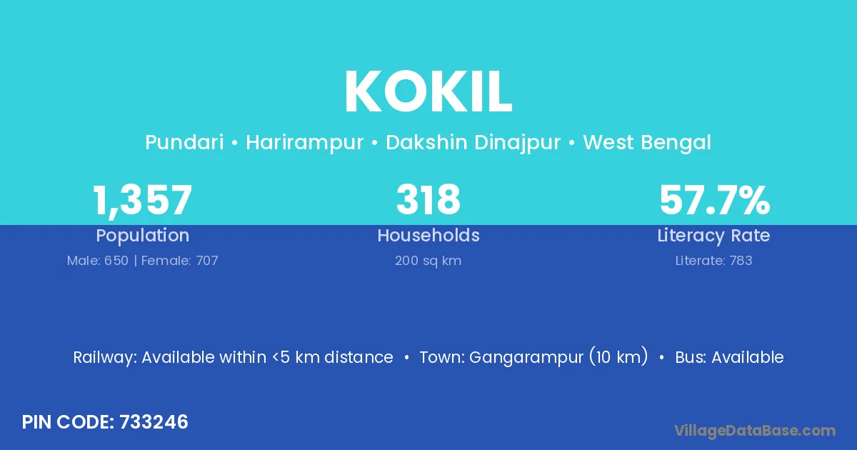 Gangarampur (10 km) is the nearest town to Kokil village for major economic activities and is located approximately 10 km away.