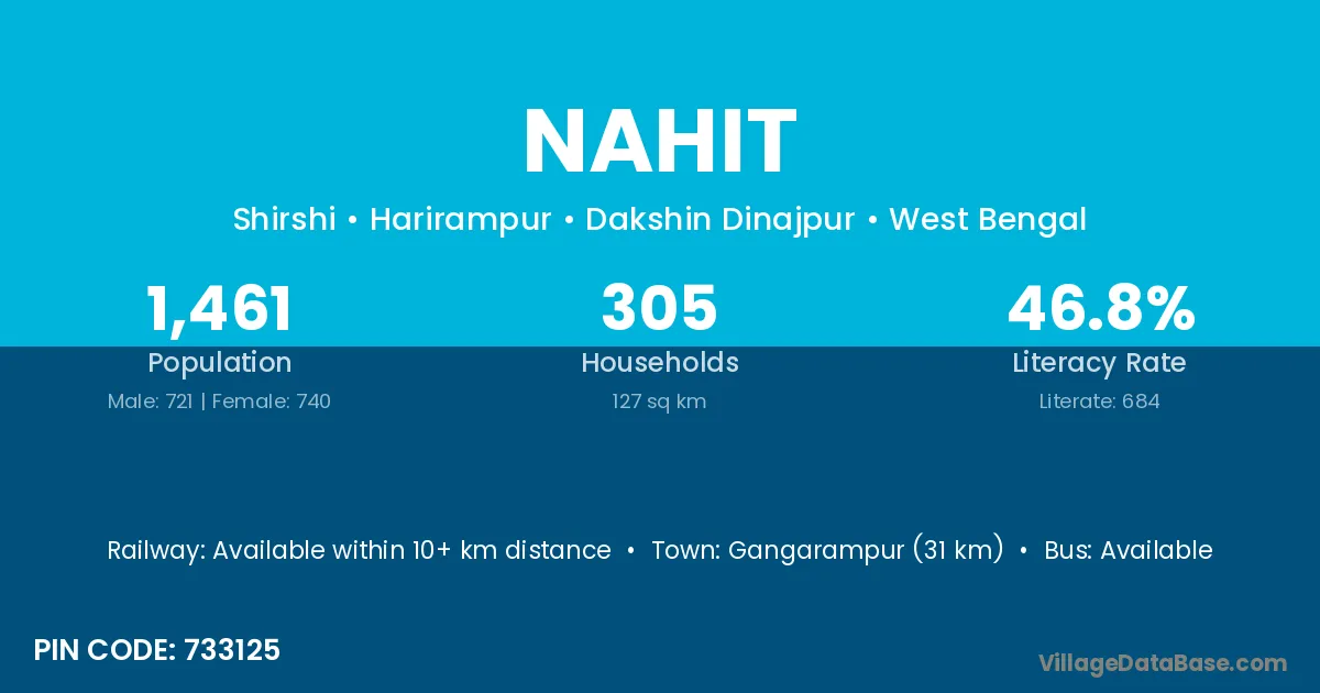 Gangarampur (31 km) is the nearest town to Nahit village for major economic activities and is located approximately 31 km away.
