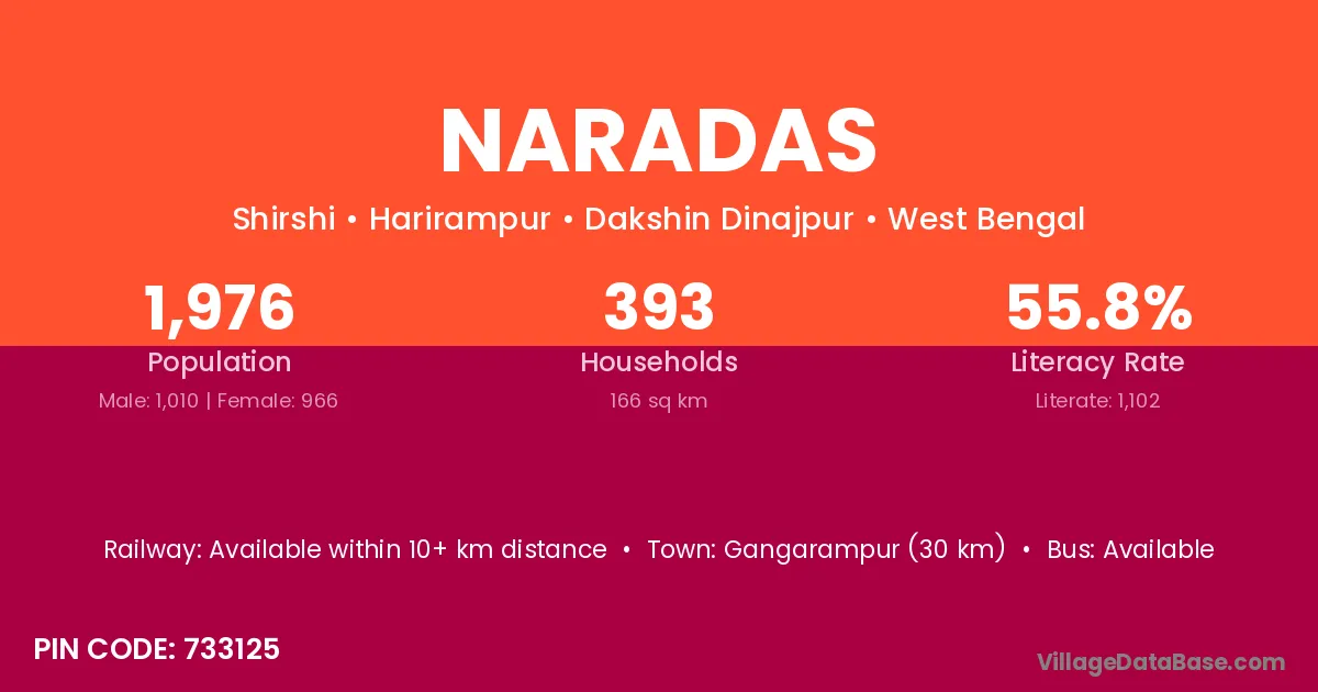 Gangarampur (30 km) is the nearest town to Naradas village for major economic activities and is located approximately 30 km away.
