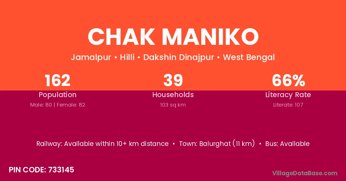 Balurghat (11 km) is the nearest town to Chak Maniko village for major economic activities and is located approximately 11 km away.