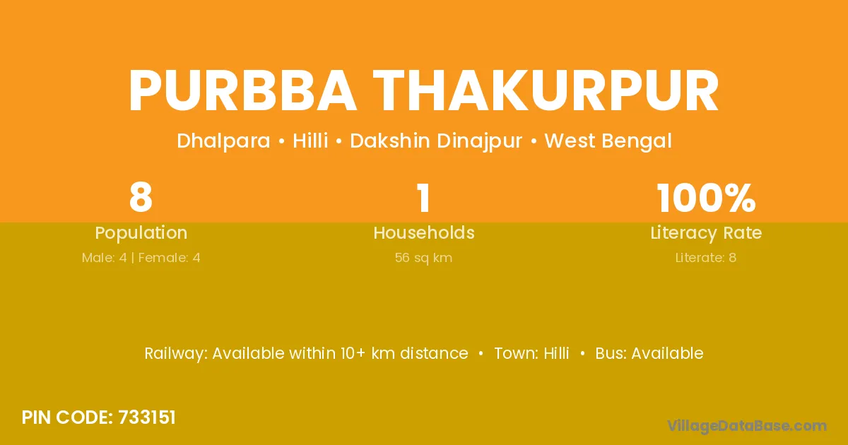 Purbba Thakurpur village has a total population of 8 people, of which 4 are males and 4 are females.