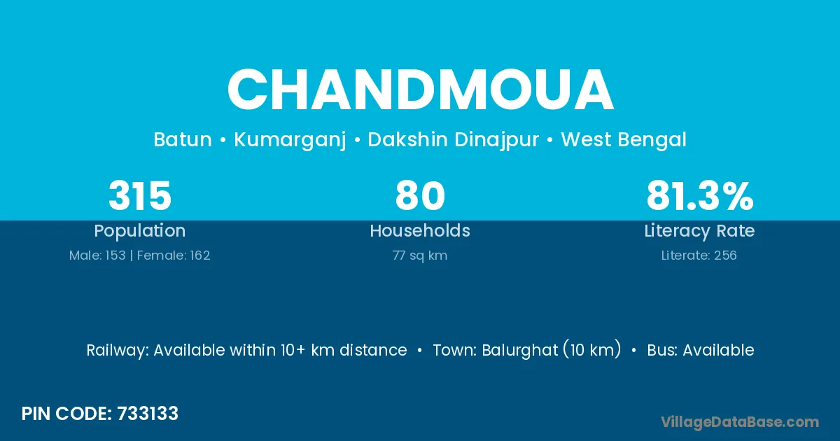 Balurghat (10 km) is the nearest town to Chandmoua village for major economic activities and is located approximately 10 km away.