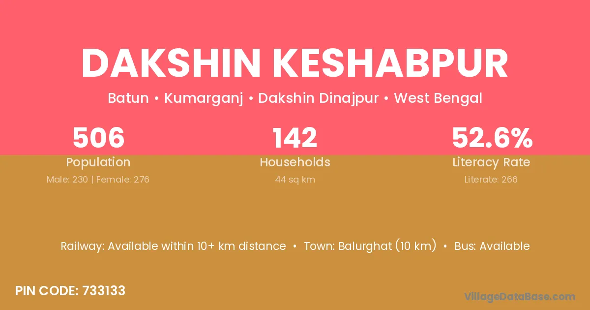 Dakshin Keshabpur village has a total population of 506 people, of which 230 are males and 276 are females.