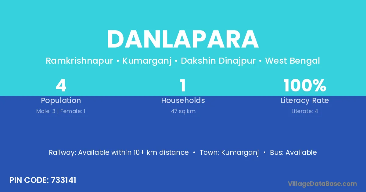 The literacy rate of Danlapara village is 100.00%. Male literacy stands at 100.00% and female literacy at 100.00%.