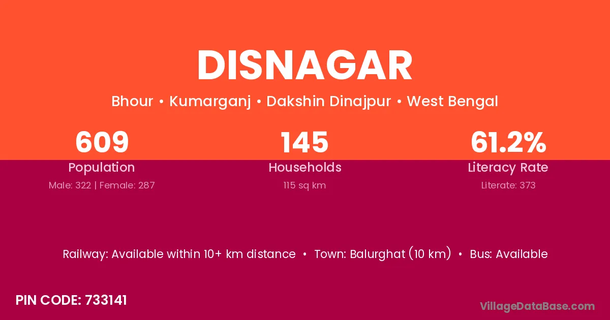 Balurghat (10 km) is the nearest town to Disnagar village for major economic activities and is located approximately 10 km away.