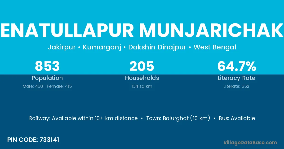 Enatullapur Munjarichak village has a total population of 853 people, of which 438 are males and 415 are females.