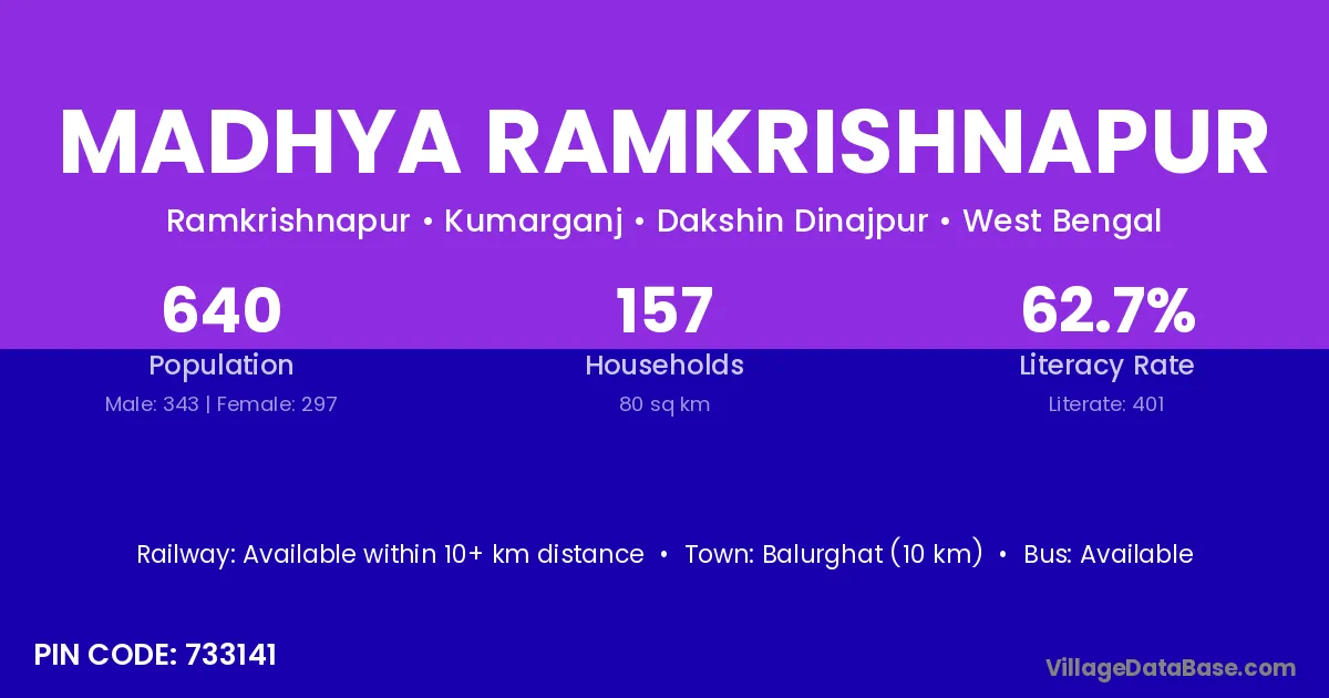 Balurghat (10 km) is the nearest town to Madhya Ramkrishnapur village for major economic activities and is located approximately 10 km away.