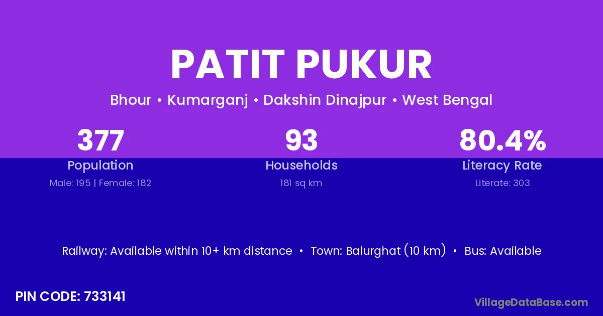 Balurghat (10 km) is the nearest town to Patit Pukur village for major economic activities and is located approximately 10 km away.