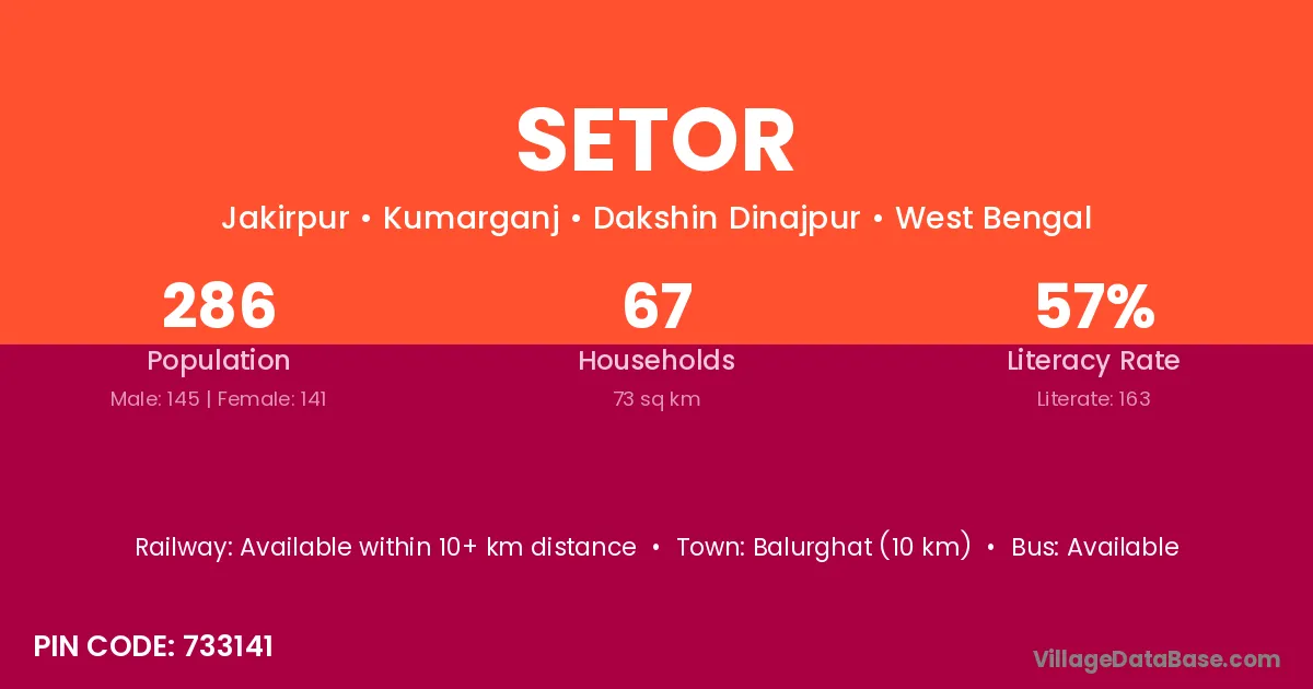 Balurghat (10 km) is the nearest town to Setor village for major economic activities and is located approximately 10 km away.