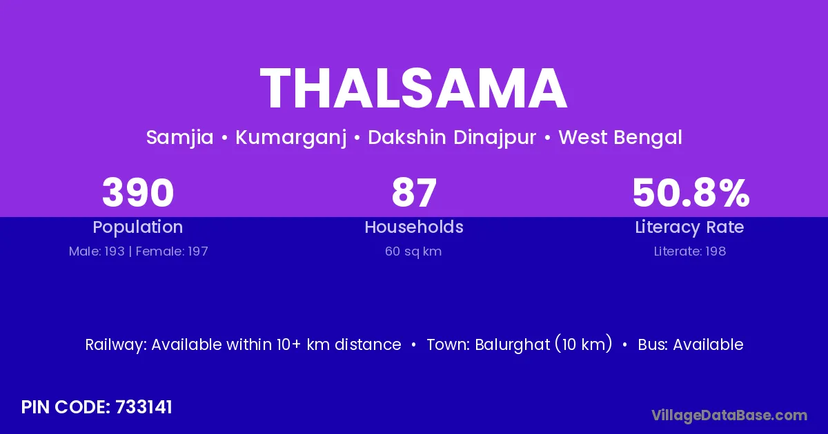 Balurghat (10 km) is the nearest town to Thalsama village for major economic activities and is located approximately 10 km away.