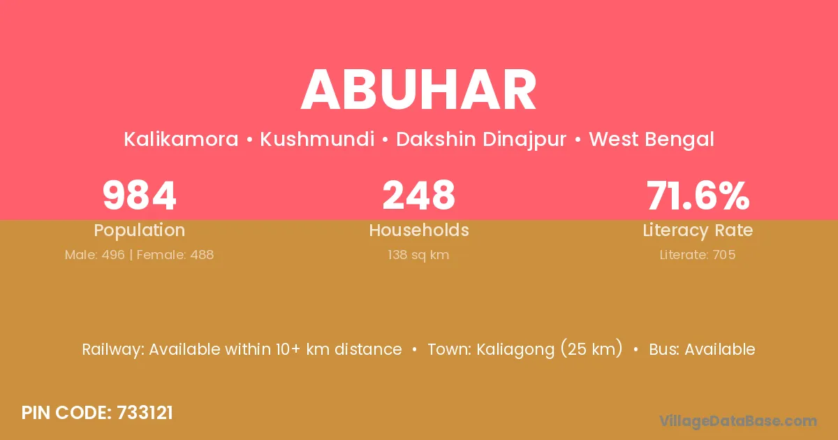 Kaliagong (25 km) is the nearest town to Abuhar village for major economic activities and is located approximately 25 km away.