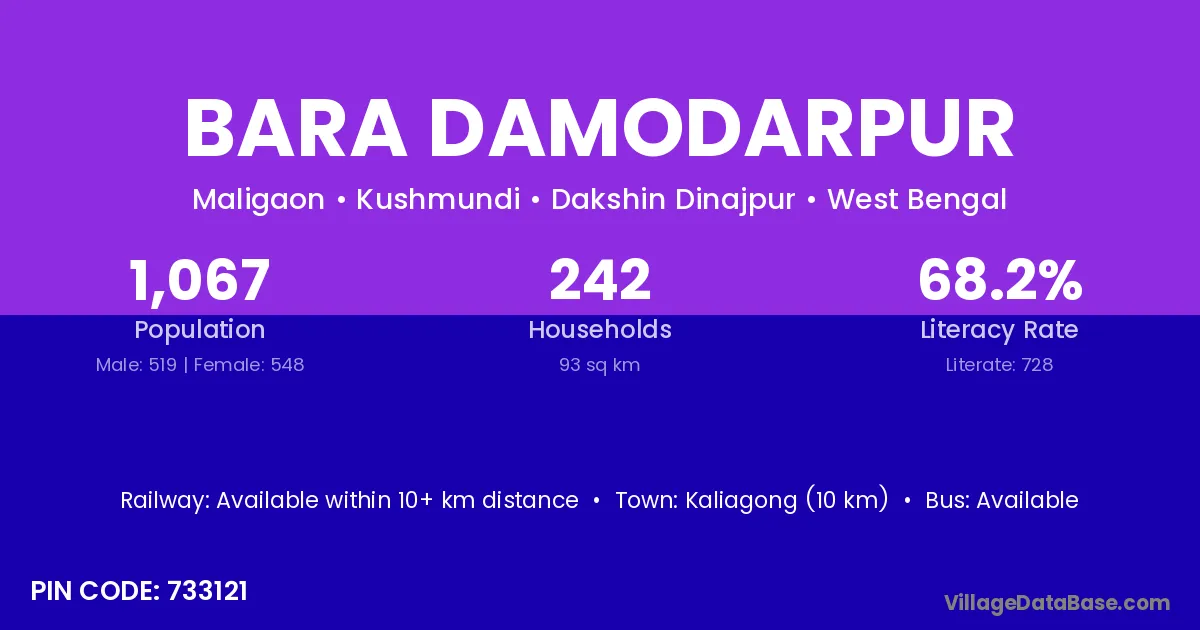 Kaliagong (10 km) is the nearest town to Bara Damodarpur village for major economic activities and is located approximately 10 km away.