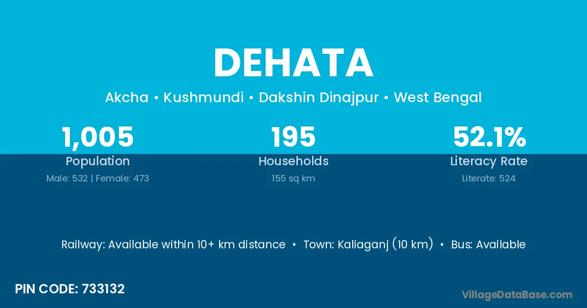 Kaliaganj (10 km) is the nearest town to Dehata village for major economic activities and is located approximately 10 km away.