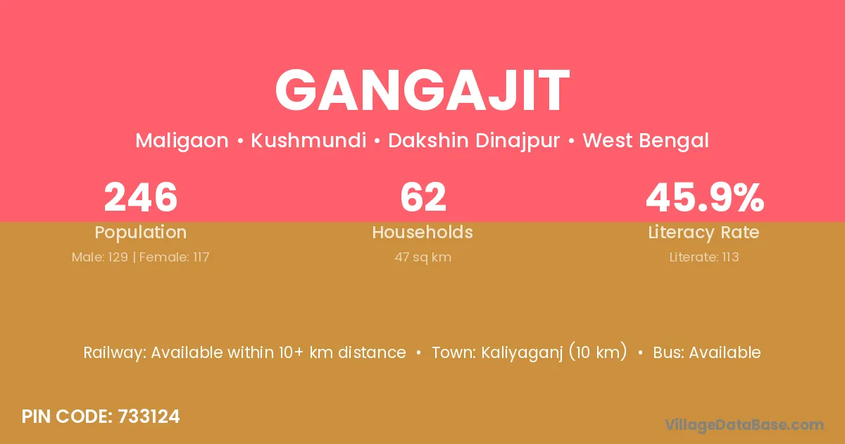 Kaliyaganj (10 km) is the nearest town to Gangajit village for major economic activities and is located approximately 10 km away.
