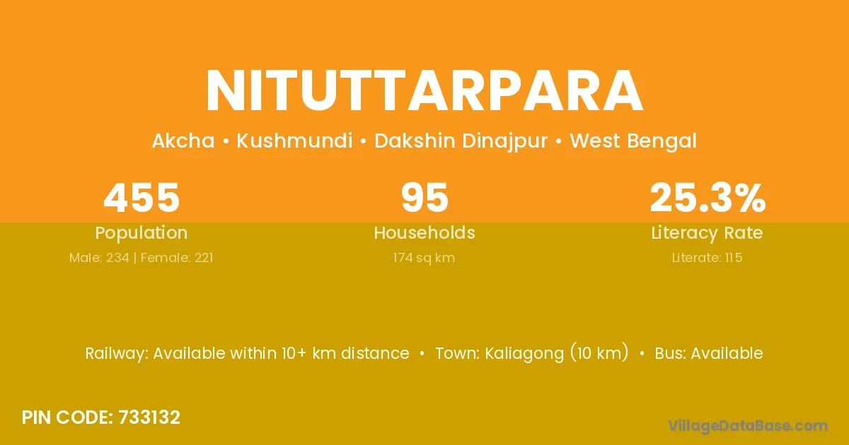 Nituttarpara village has a total population of 455 people, of which 234 are males and 221 are females.