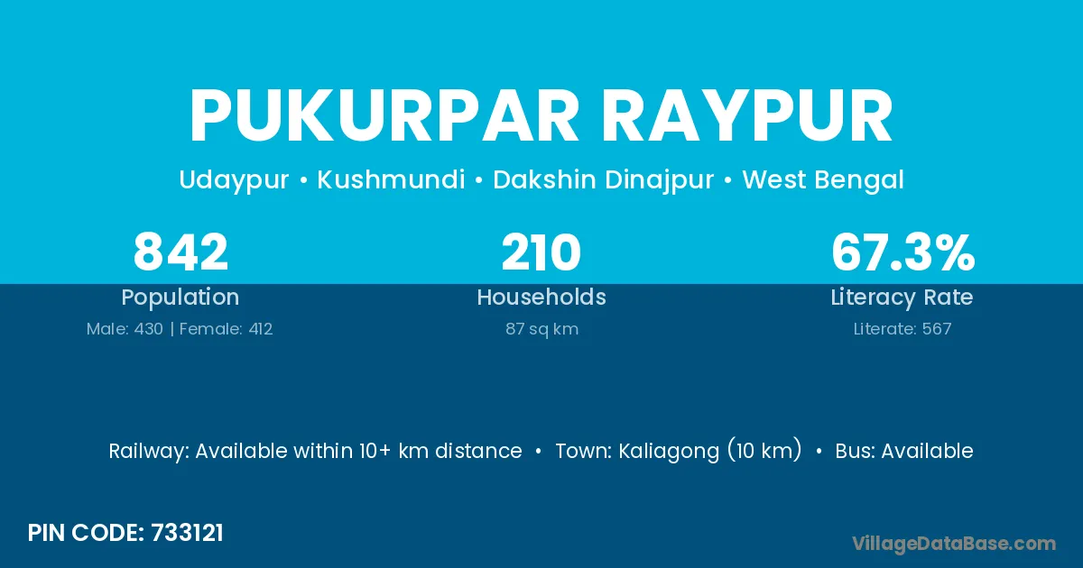 Kaliagong (10 km) is the nearest town to Pukurpar Raypur village for major economic activities and is located approximately 10 km away.