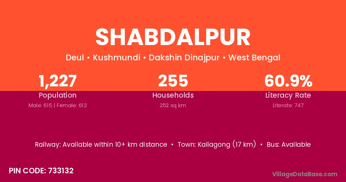 Kaliagong (17 km) is the nearest town to Shabdalpur village for major economic activities and is located approximately 17 km away.