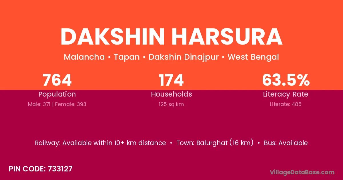 Balurghat (16 km) is the nearest town to Dakshin Harsura village for major economic activities and is located approximately 16 km away.