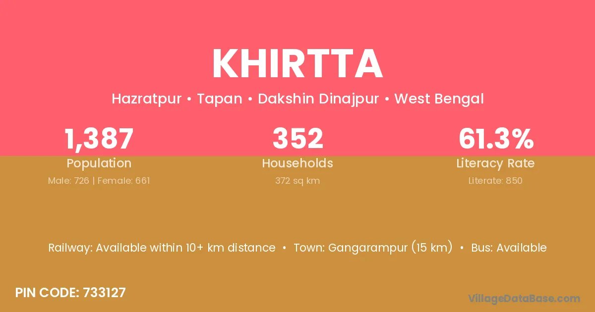 Gangarampur (15 km) is the nearest town to Khirtta village for major economic activities and is located approximately 15 km away.