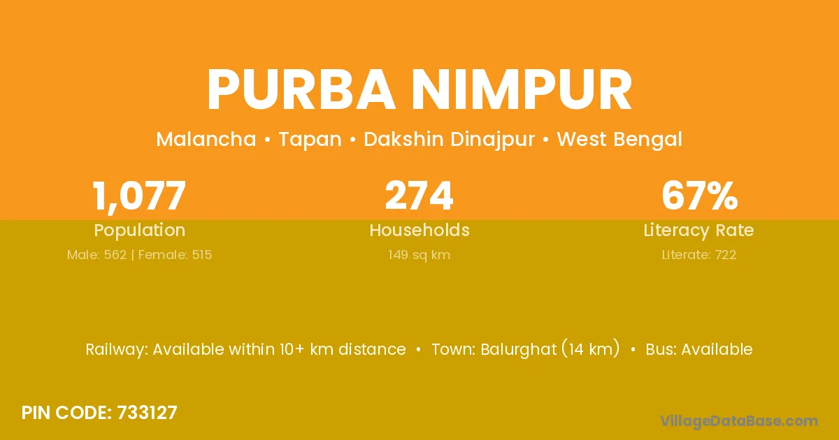 Balurghat (14 km) is the nearest town to Purba Nimpur village for major economic activities and is located approximately 14 km away.
