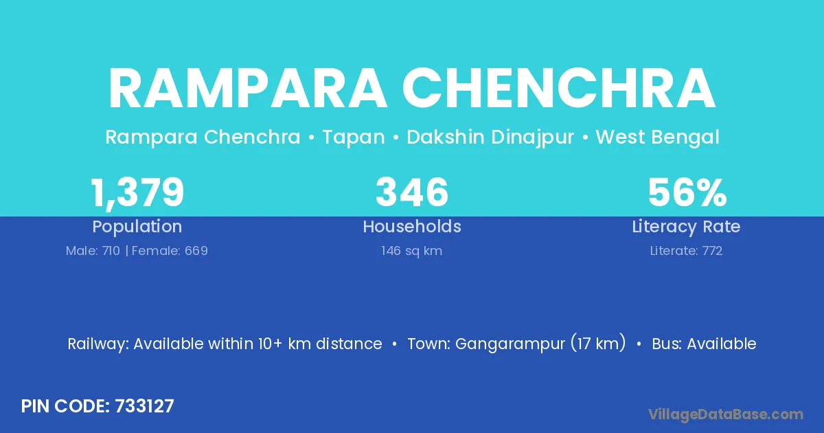 Gangarampur (17 km) is the nearest town to Rampara Chenchra village for major economic activities and is located approximately 17 km away.