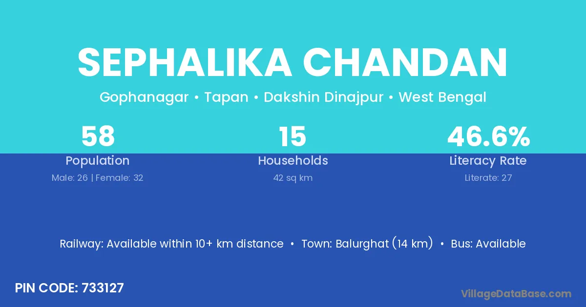 Sephalika Chandan village has a total population of 58 people, of which 26 are males and 32 are females.