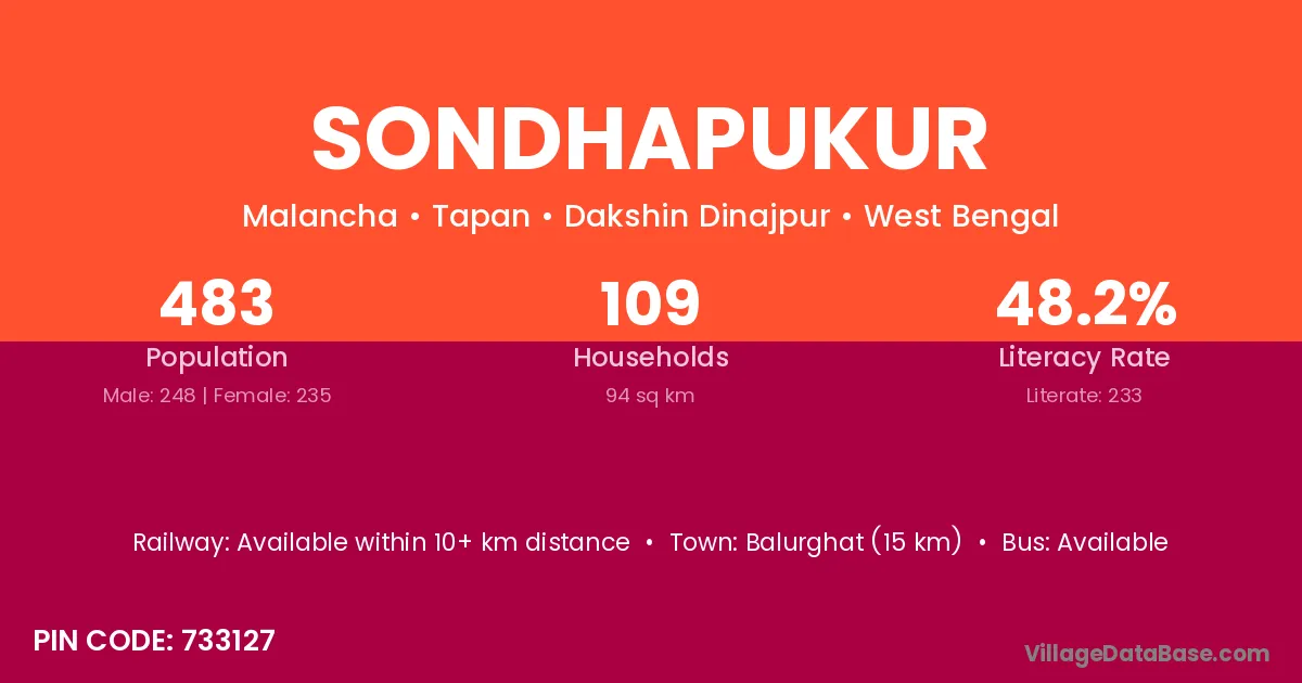 Sondhapukur village has a total population of 483 people, of which 248 are males and 235 are females.