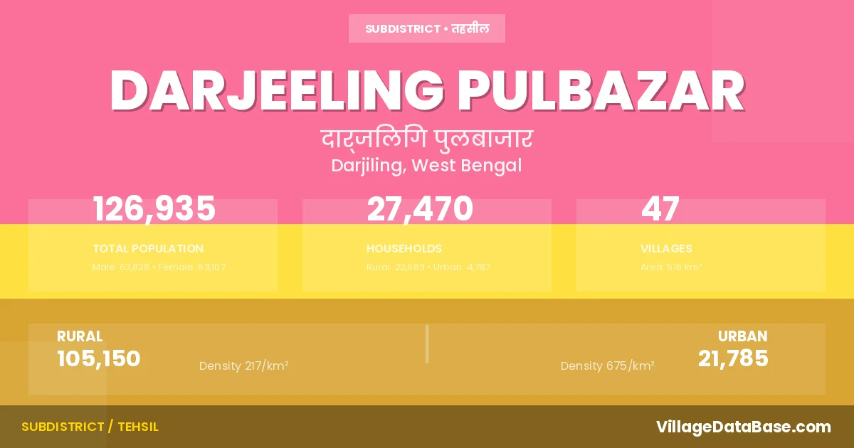According to the 2011 census The total area of Darjeeling Pulbazar Subdivision is 516 km², with a population of 126935 people. The population density is 246 inhabitants per square kilometre, and there are approximately 27470 houses in the sub district.