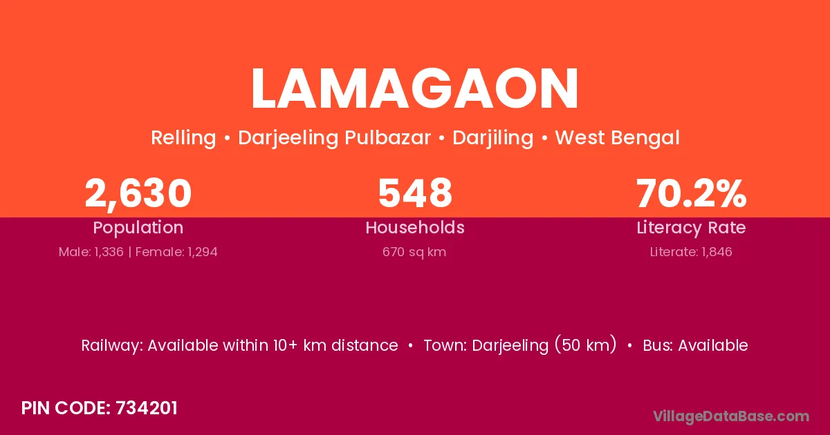 Darjeeling (50 km) is the nearest town to Lamagaon village for major economic activities and is located approximately 50 km away.