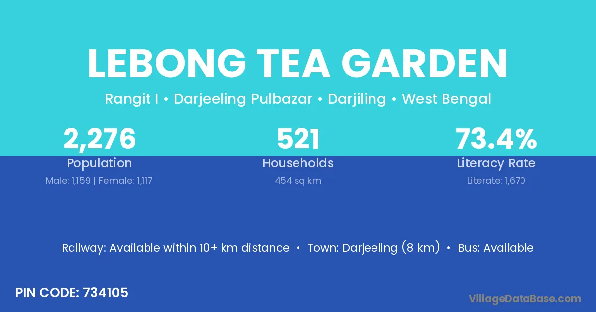 Darjeeling (8 km) is the nearest town to Lebong Tea Garden village for major economic activities and is located approximately 8 km away.