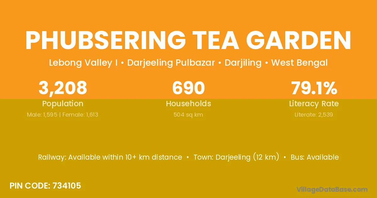 Phubsering Tea Garden village has a total population of 3,208 people, of which 1,595 are males and 1,613 are females.