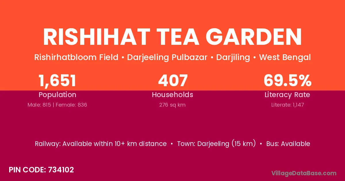 Darjeeling (15 km) is the nearest town to Rishihat Tea Garden village for major economic activities and is located approximately 15 km away.