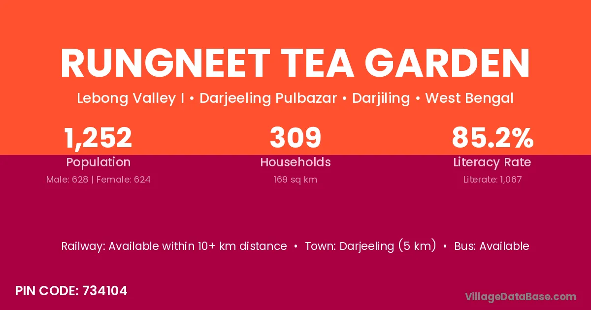 Rungneet Tea Garden village has a total population of 1,252 people, of which 628 are males and 624 are females.