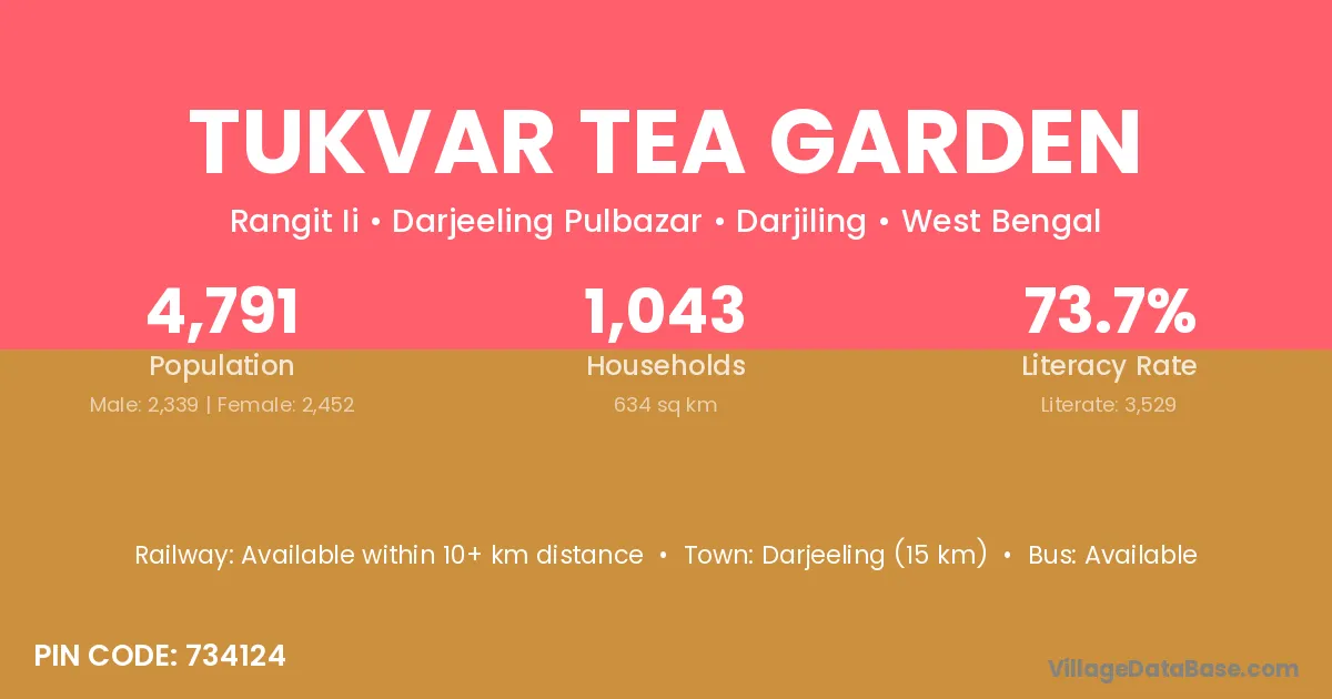Darjeeling (15 km) is the nearest town to Tukvar Tea Garden village for major economic activities and is located approximately 15 km away.