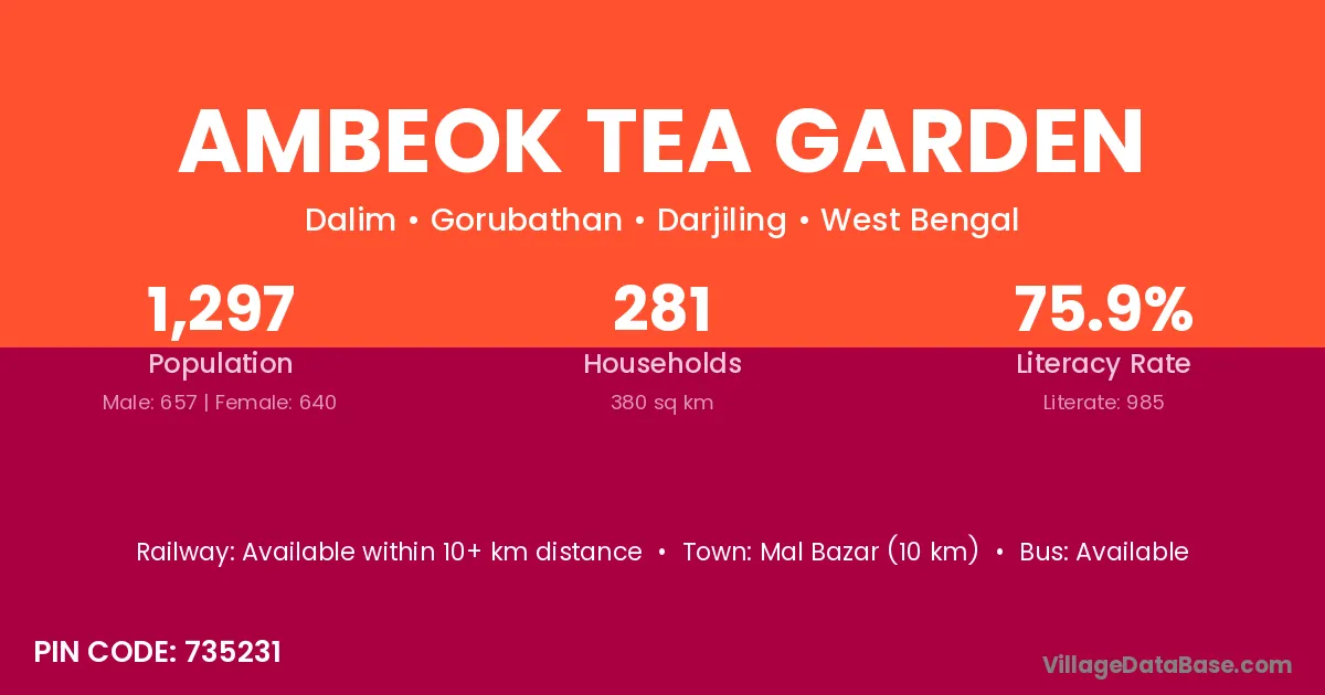 Mal Bazar (10 km) is the nearest town to Ambeok Tea Garden village for major economic activities and is located approximately 10 km away.