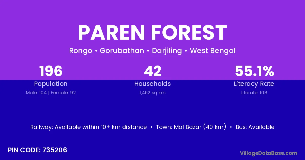 Mal Bazar (40 km) is the nearest town to Paren Forest village for major economic activities and is located approximately 40 km away.