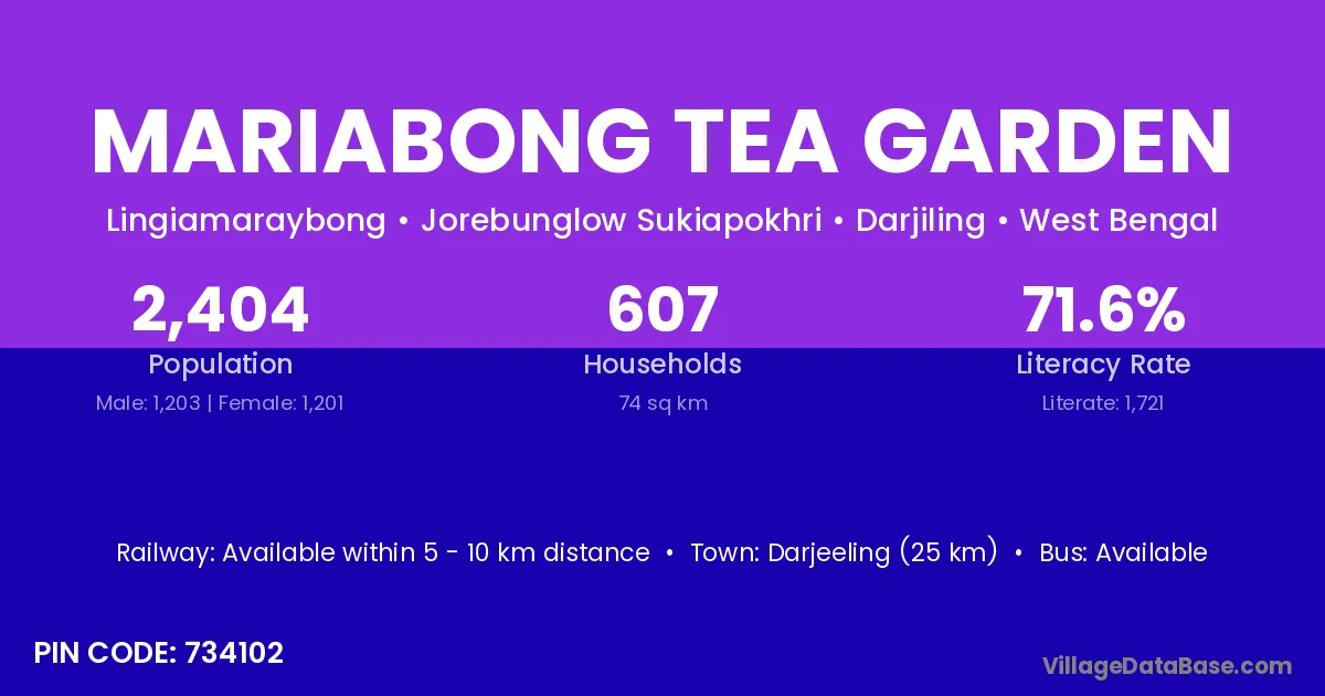Darjeeling (25 km) is the nearest town to Mariabong Tea Garden village for major economic activities and is located approximately 25 km away.