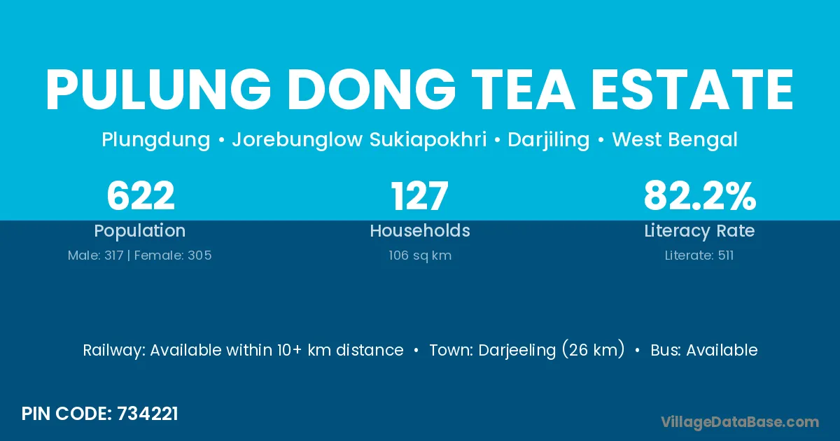 Darjeeling (26 km) is the nearest town to Pulung Dong Tea Estate village for major economic activities and is located approximately 26 km away.
