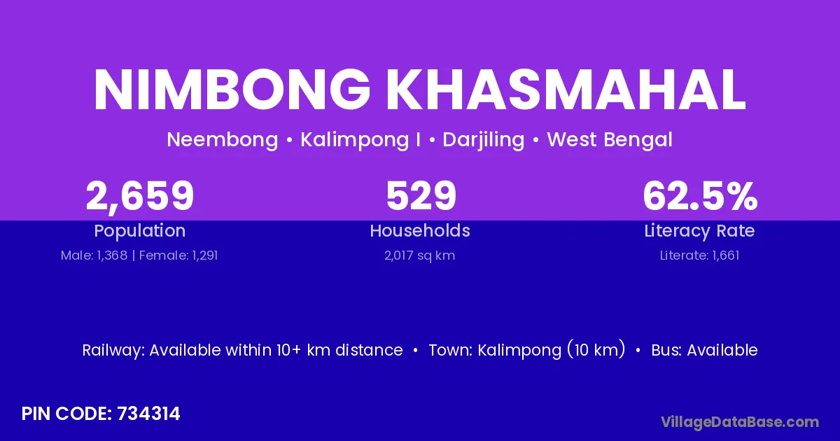 Kalimpong (10 km) is the nearest town to Nimbong Khasmahal village for major economic activities and is located approximately 10 km away.