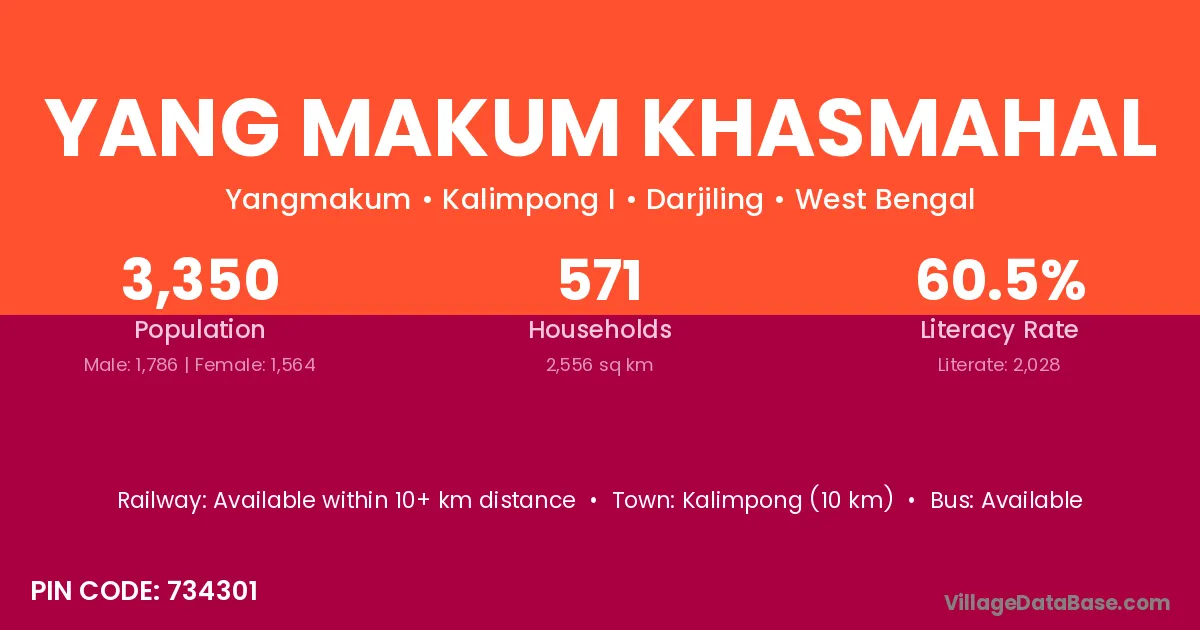 Kalimpong (10 km) is the nearest town to Yang Makum Khasmahal village for major economic activities and is located approximately 10 km away.