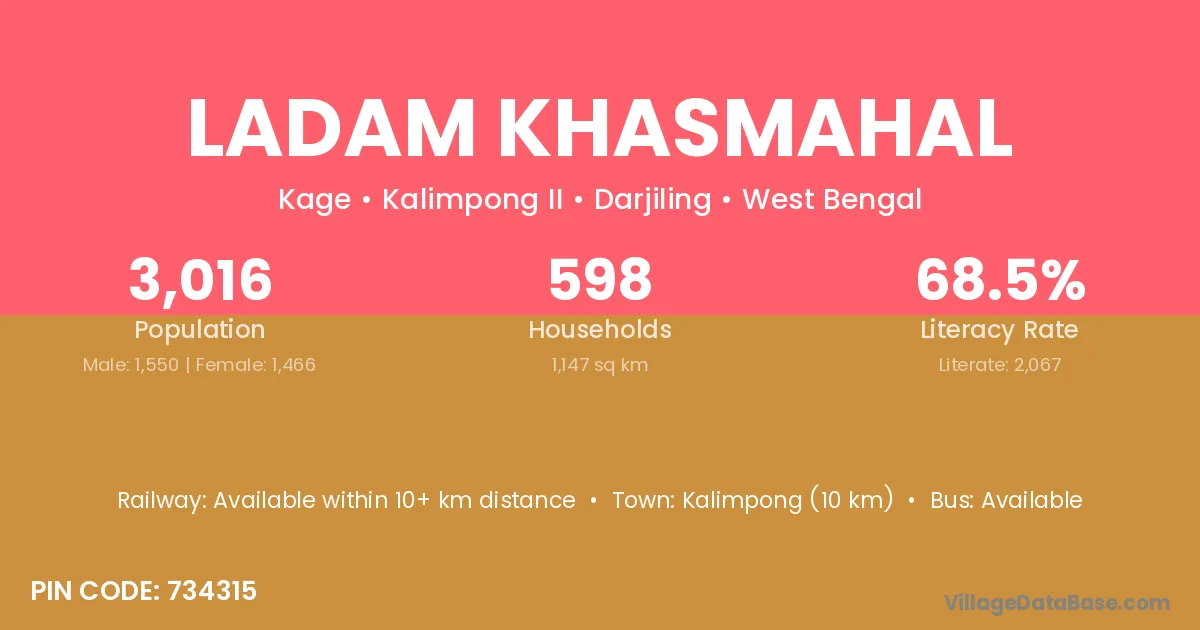 Kalimpong (10 km) is the nearest town to Ladam Khasmahal village for major economic activities and is located approximately 10 km away.