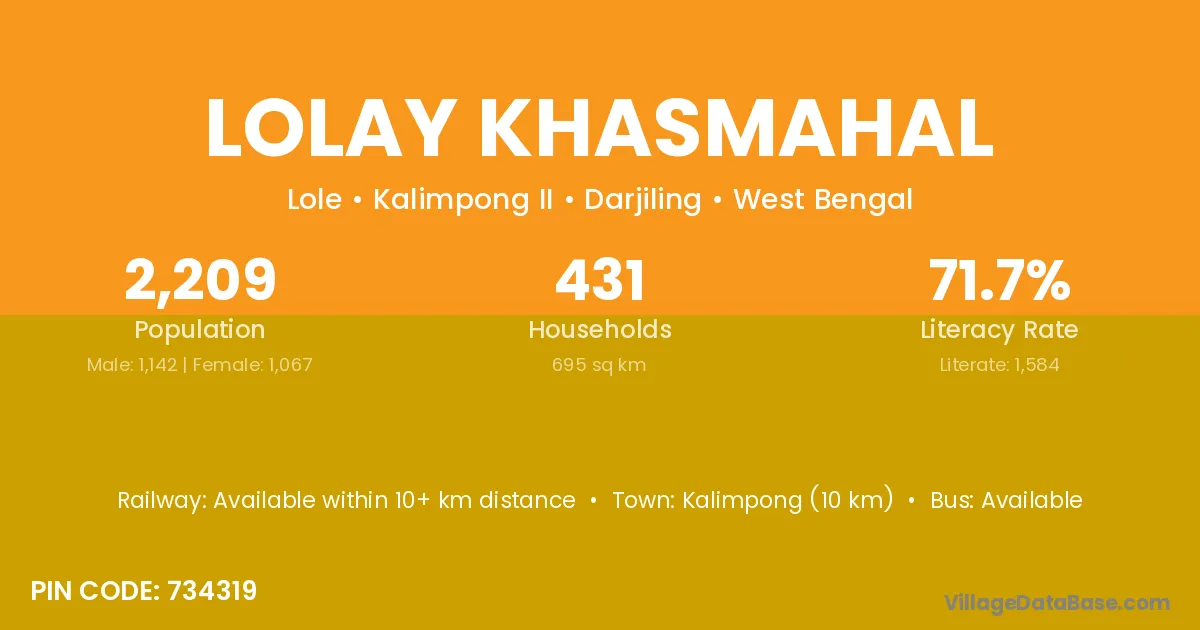 Kalimpong (10 km) is the nearest town to Lolay Khasmahal village for major economic activities and is located approximately 10 km away.