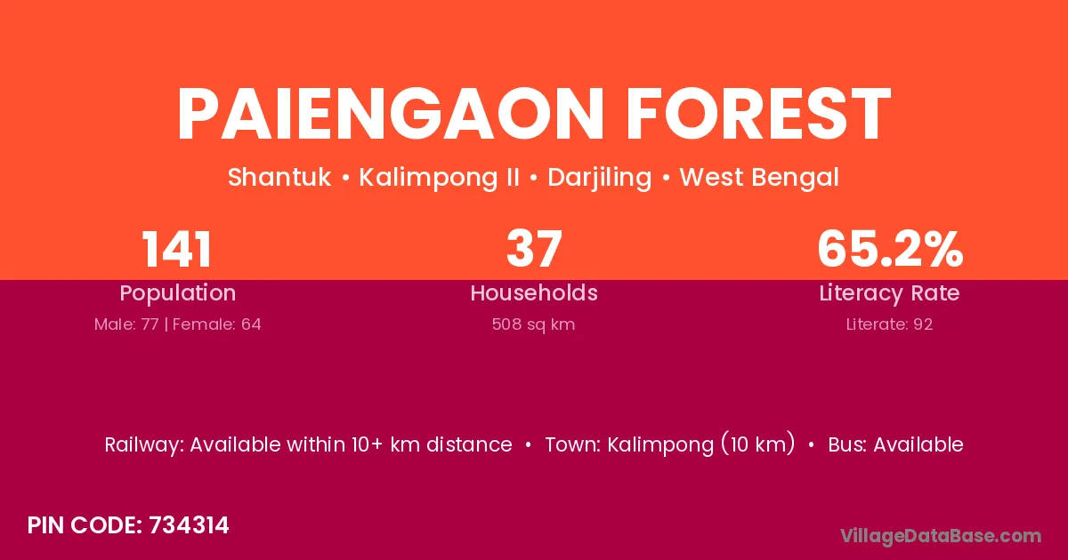 Kalimpong (10 km) is the nearest town to Paiengaon Forest village for major economic activities and is located approximately 10 km away.