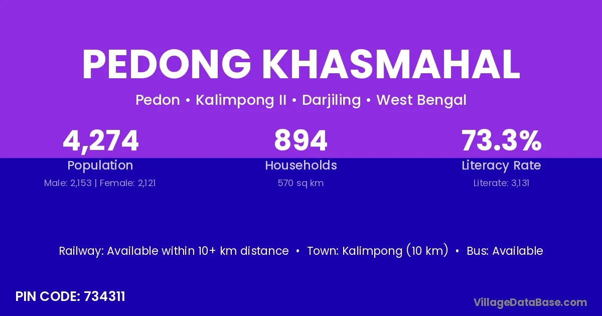 Kalimpong (10 km) is the nearest town to Pedong Khasmahal village for major economic activities and is located approximately 10 km away.