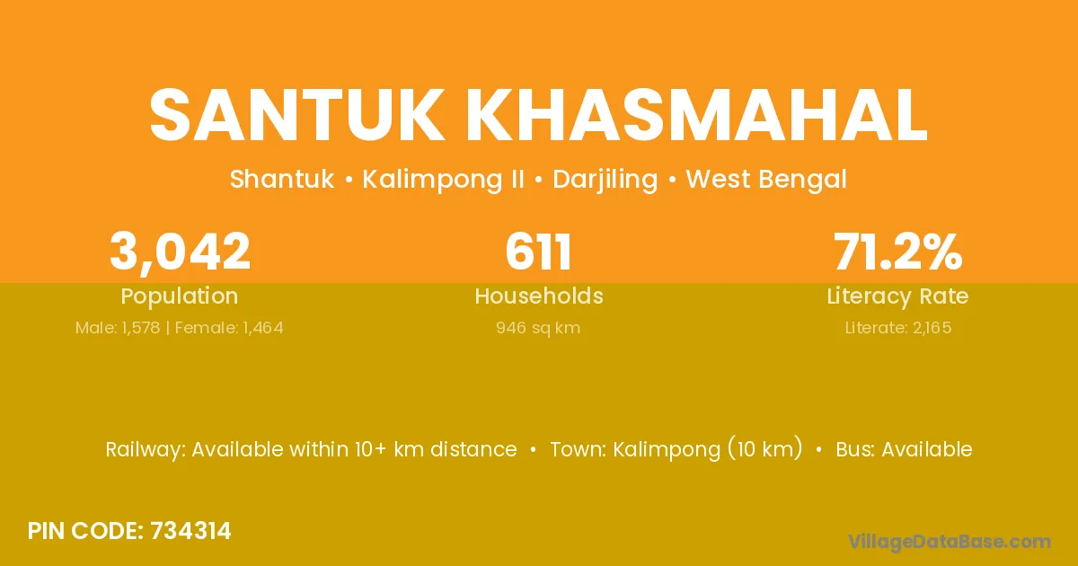 Kalimpong (10 km) is the nearest town to Santuk Khasmahal village for major economic activities and is located approximately 10 km away.