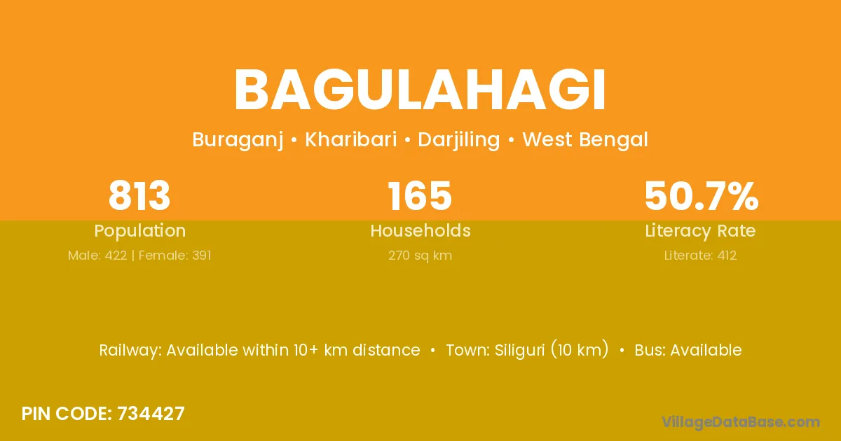 Siliguri (10 km) is the nearest town to Bagulahagi village for major economic activities and is located approximately 10 km away.