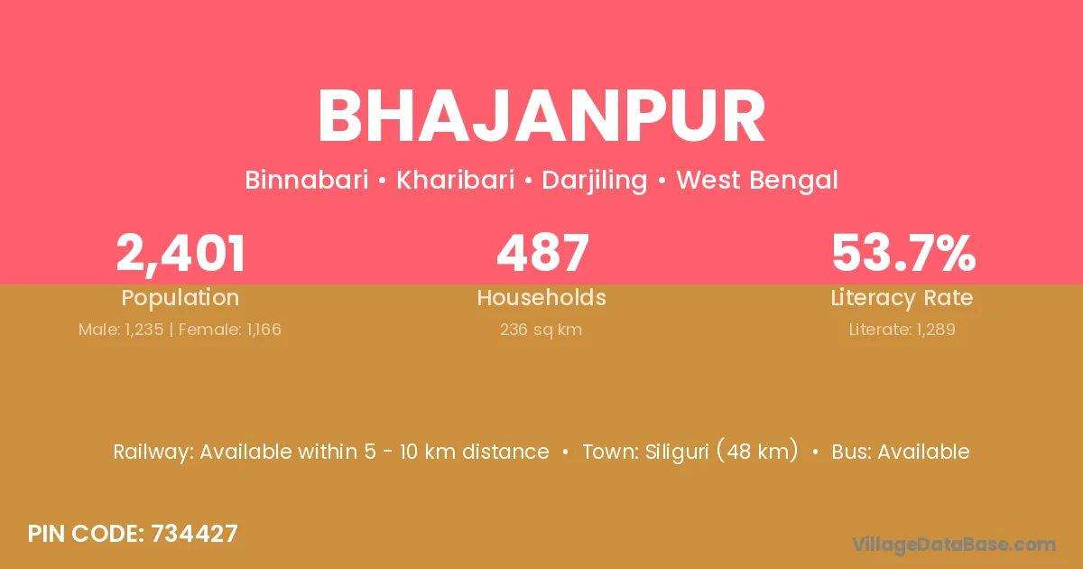 Siliguri (48 km) is the nearest town to Bhajanpur village for major economic activities and is located approximately 48 km away.